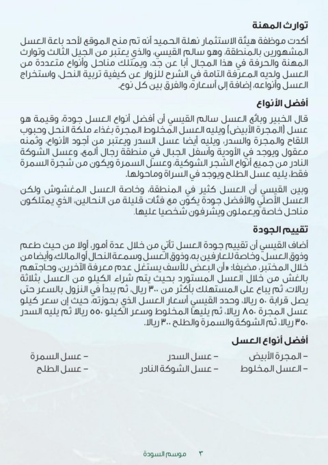 يصل قرابة 50ريالا ،وحدد القيسي أسعار العسل الذي بحوزته ،حيث إن سعر كيلو