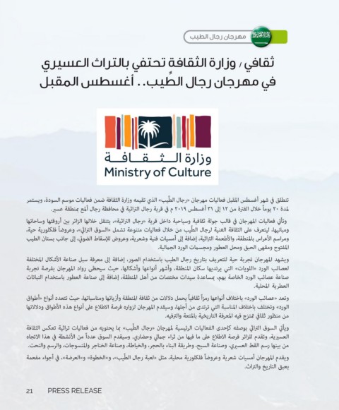لمدة 20يوماً خلال الفترة من 12إلى 31أغسطس 2019م في قرية رجال التراثية في محافظة رجال ألمع بمنطقة عسير.