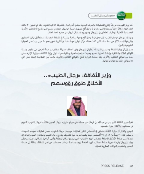 الجدير بالذكر أن وزارة الثقافة ستطلق في أغسطس المقبل فعاليات مهرجان «رجال الطيب» ضمن فعاليات «موسم السودة»