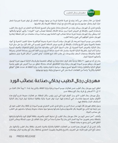 ويأتي مهرجان رجال الطيب الذي يسل أطواق الورد التي تزين رؤوس سكان المنطقة ،عبر فعاليات متنوعة تشرح أنواع هذه