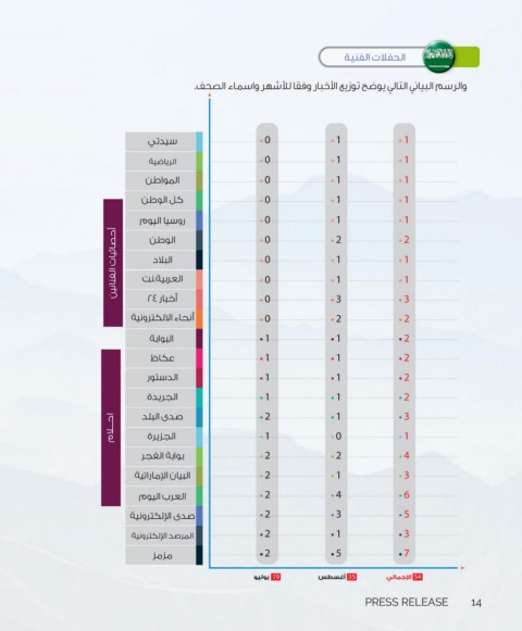 والرسم البياني التالي يوضح توزيع الأخبار وفقا للأشهر واسماء الصحف.