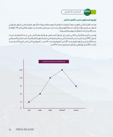 عـدد الأخبـار مـن شـهر مايـو بعـدد ١٣خبـر ثـم يونيـو بعـدد ١٨خبـر ،ثـم يوليـو بثانـي أعلـى كميـة أخبـار حيـث