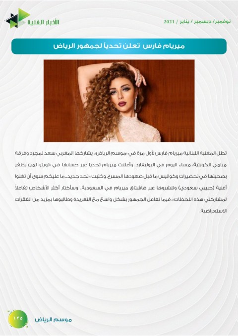 تطل المغنية اللبنانية ميريام فارس لأول مرة في «موسم الرياض» ،يشاركها المغربي سعد لمجرد وفرقة