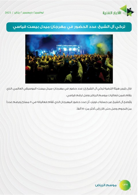 قال رئيس هيئة الترفيه تركي آل الشيخ إن عدد حضور في مهرجان «ميدل بيست» الموسيقي العالمي ،الذي