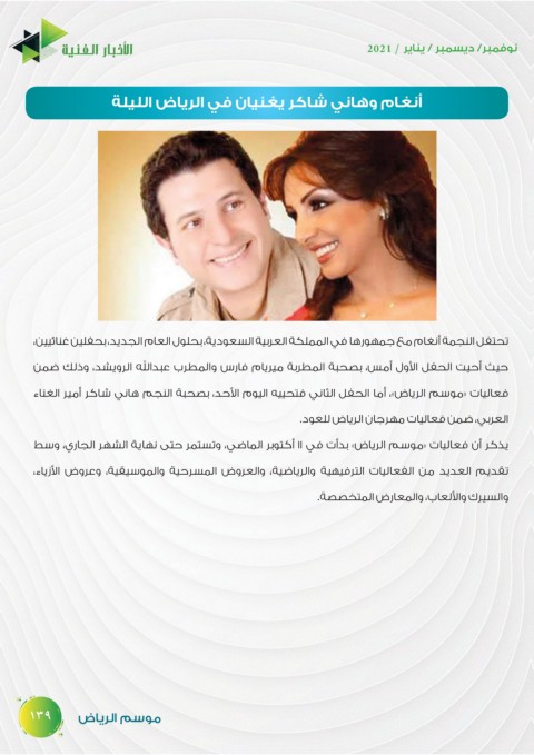 فعاليات «موسم الرياض» ،أما الحفل الثاني فتحييه اليوم الأحد ،بصحبة النجم هاني شاكر أمير الغناء
