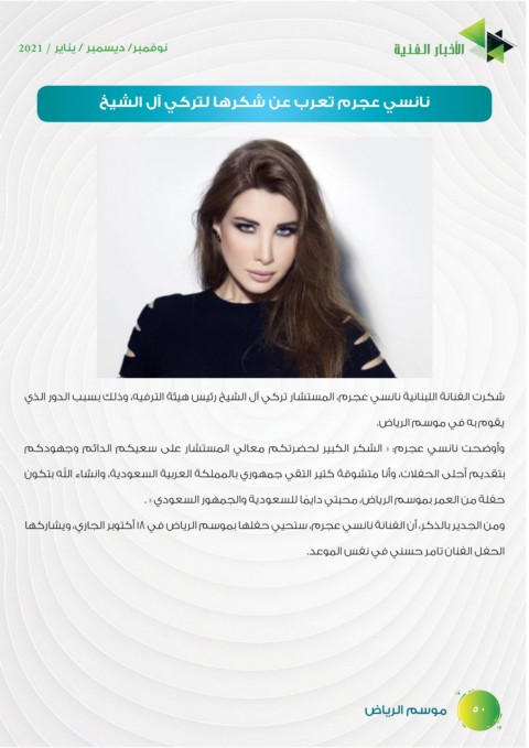ومن الجدير بالذكر ،أن الفنانة نانسي عجرم ،ستحيي حفلها بموسم الرياض في ١8أكتوبر الجاري ،ويشاركها