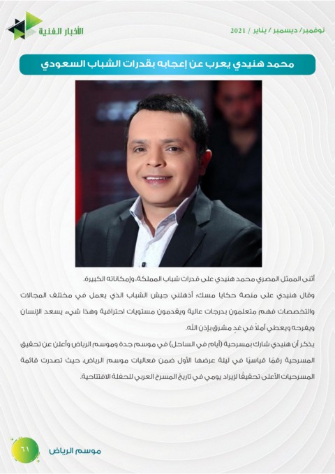 ‫أثنى الممثل المصري محمد هنيدي على قدرات شباب المملكة‪ ،‬وإمكاناته الكبيرة‪.‬‬