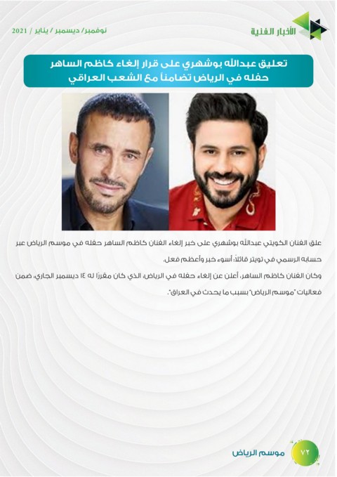 ‫وكان الفنان كاظم الساهر‪ ،‬أعلن عن إلغاء حفله في الرياض‪ ،‬الذي كان مقر ًرا له ‪ ١4‬ديسمبر الجاري‪ ،‬ضمن‬