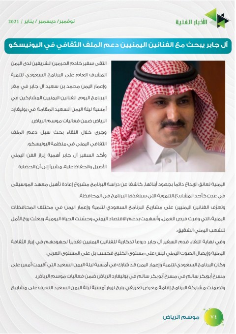 وكان البرنامج السعودي لتنمية وإعمار اليمن قد شارك في أمسية ليلة اليمن السعيد التي أقيمت أمس على