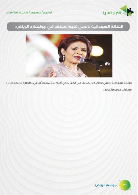 نوفمبر /ديسمبر /يناير 2020/2019/ الفنانة السودانية نانسي تقيم حفلها في «بوليفارد الرياض» الفنانة السودانية نانسي عجاج ،خلال غنائها في الحفل الذي أقيم ليلة أمس الأول في «بوليفارد الرياض» ضمن فعاليات موسم الرياض. 32موسم الرياض