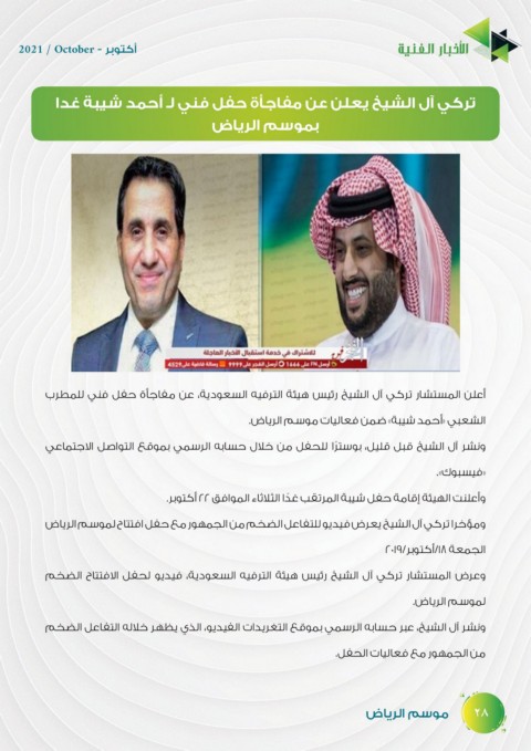 تركي آل الشيخ يعلن عن مفاجأة حفل فني لـ أحمد شيبة غدا