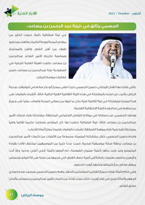 وقدم حسين الجسمي ،خلال مشاركته المتميزة ،مجموعة من الأغنيات ،من كلمات الأمير عبدالرحمن
