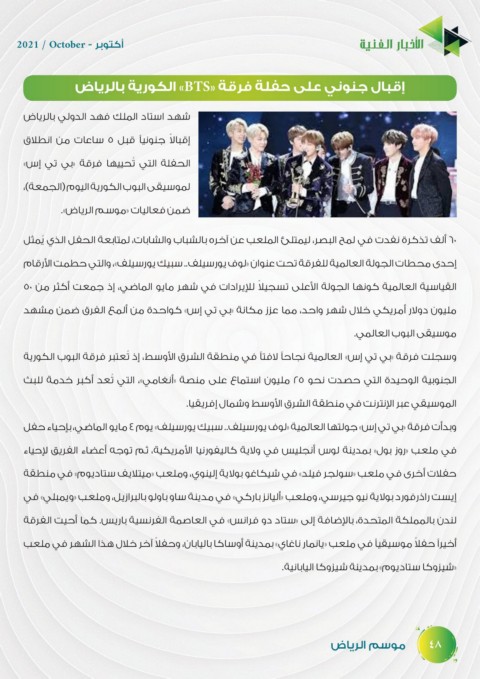 وسجلت فرقة «بي تي إس» العالمية نجاحًا لافتًا في منطقة الشرق الأوسط ،إذ ُتعتبر فرقة البوب الكورية