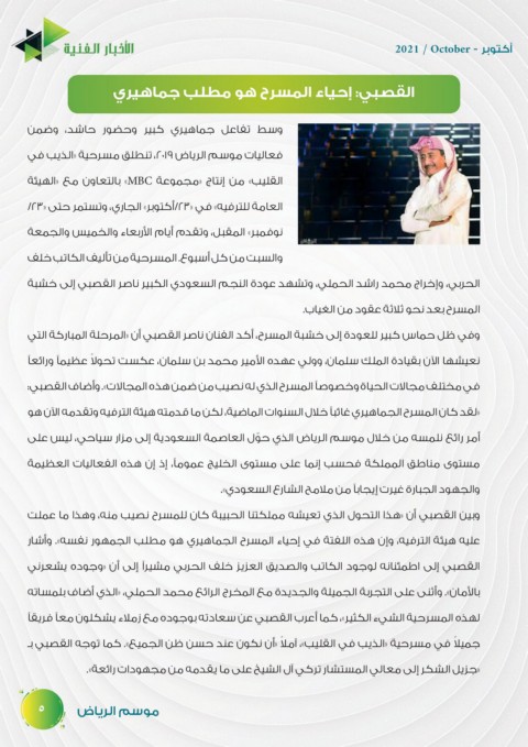 وبين القصبي أن «هذا التحول الذي تعيشه مملكتنا الحبيبة كان للمسرح نصيب منه ،وهذا ما عملت